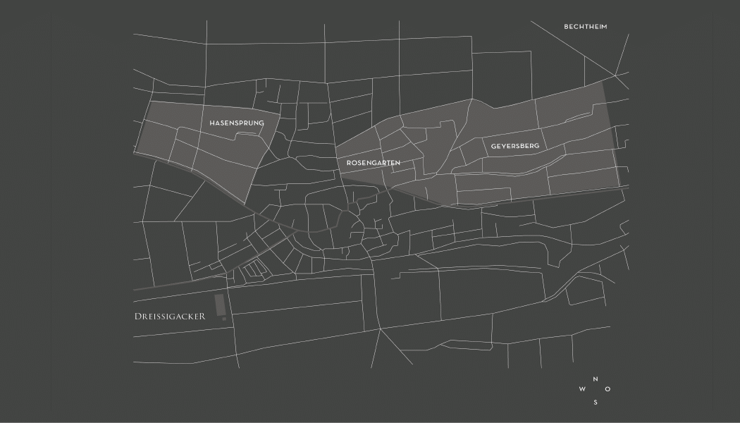 De belangrijkste bodemsoorten in Rosengarten, dat grenst aan Geyersberg, zijn löss en kalksteengruis. Rosengarten is een van de warmste locaties in Bechtheim, en daarom barsten de wijnen van de rijpe, geconcentreerde fruitsmaken die blijven hangen in de mond. Bovendien zorgt de lichtere bodem voor een verfijnd karakter met een frisse, bloemige smaak.